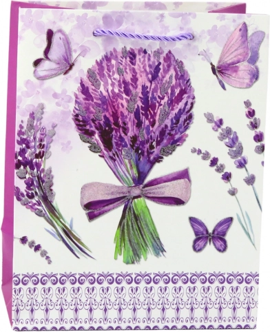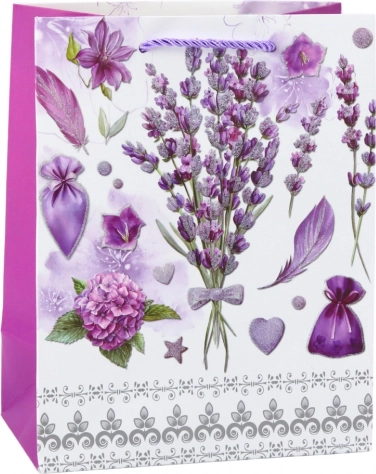 Le sac est fabriqué en carton décoratif de haute qualité, garantissant sa durabilité et son esthétique même en cas d’utilisation fréquente. Le motif lavande, combiné à des accents scintillants et à des éléments violets, confère à l’ensemble charme et élégance. Des anses cordon violettes et solides assurent un port confortable, et la structure robuste permet d’emballer en toute sécurité des cadeaux de petite à moyenne taille.
