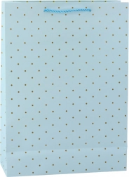 Ce sac cadeau stylé avec un motif délicat de points dorés est la solution idéale pour ceux qui privilégient la classique, la simplicité et l'élégance. Grâce à son design universel et délicat, il est un excellent choix autant pour les occasions formelles que personnelles. Le sac est disponible en quatre teintes pastel et sobres – bleu clair, beige, blanc et turquoise – qui s'adaptent facilement à l'occasion, au type de cadeau ou à la personne à qui il est destiné. L'impression dorée et brillante en forme de points ajoute un caractère noble et est un complément élégant au fond simple.