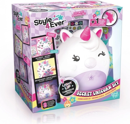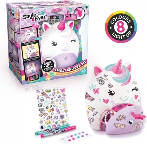 Le coffret contient tout le nécessaire : une figurine licorne lumineuse avec compartiment secret pour petits trésors, 2 feutres colorés pour dessiner, des autocollants et strass scintillants pour la personnalisation, ainsi qu'un mode d'emploi détaillé. Idéal pour les petits artistes et les amoureux des décorations féériques.