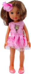 La poupée a un visage soigneusement travaillé avec un doux sourire et de grands yeux brillants qui lui donnent un air amical. Ses longs cheveux brun foncé sont ornés d’une fleur qui souligne son caractère féminin. Grâce à sa finition esthétique, la poupée attire immédiatement l’attention et devient une compagne favorite pour le jeu quotidien.