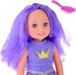Les longs cheveux violets ondulés de la poupée offrent d’innombrables possibilités de coiffures et de stylisations.