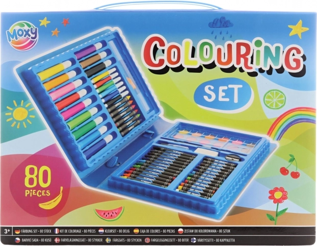 Boîte créative avec matériel de peinture 80 pcs dans une mallette en plastique. Aquarelles, feutres, crayons de cire, crayons de couleur, taille-crayon et gomme. Format compact 29×22×4 cm. Âge 3+.