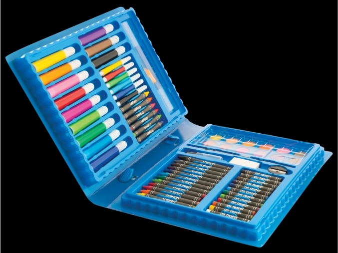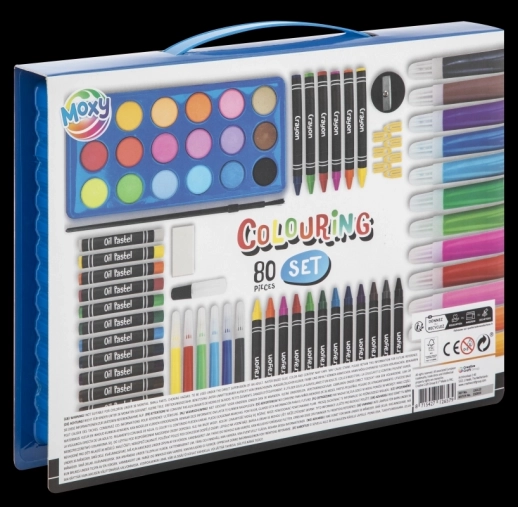 - 80 pièces d’outils : aquarelles, feutres, crayons de cire, crayons de couleur et accessoires