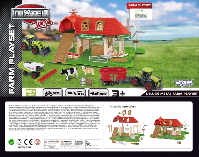 - Ferme (2 niveaux), boutique fermière, 3 tracteurs/moissonneuses, 3 figurines d’animaux