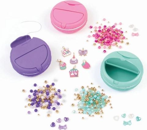 Des boîtes colorées en forme de macarons gardent toutes les perles, cordons et breloques bien organisés au même endroit et prêts pour la création – à la maison comme en déplacement.