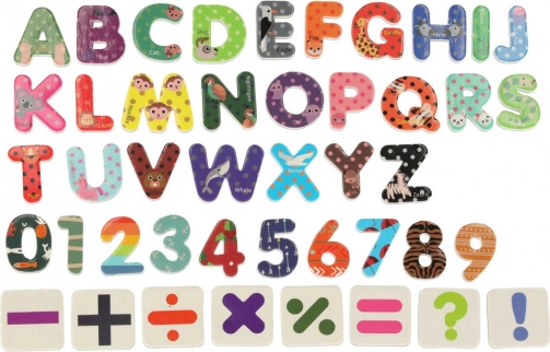 Inclus: diverses aides pédagogiques comme des lettres et chiffres magnétiques, des craies et des marqueurs.