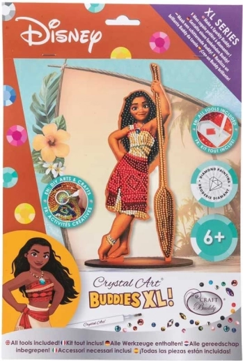 Le coffret contient tout le nécessaire pour créer l’image : une plaque en bois en forme du personnage de Vaiana, un support en bois, un stylet pour appliquer les strass, un plateau, de la cire et un assortiment de strass colorés. Le produit mesure environ 25 cm, idéal pour la décoration intérieure ou comme cadeau pour les amateurs d’activités créatives.