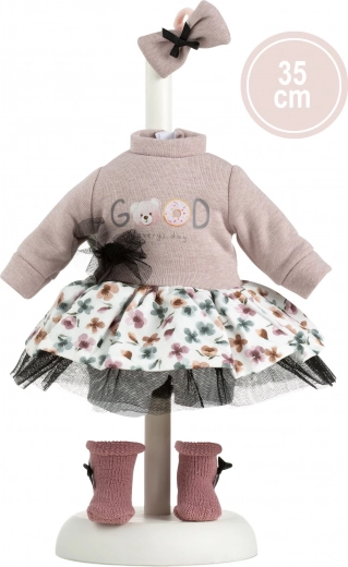L’ensemble comprend un haut à manches longues avec nœud et accent en tulle, une jupe fleurie avec bord en tulle, des chaussettes douces ornées de petits nœuds, et un élastique décoratif pour les cheveux. Grâce à sa taille universelle, il s’enfile facilement sur les poupées de 35 cm et stimule le jeu créatif.