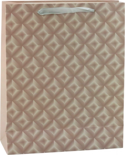 Ce sac cadeau est fabriqué en papier renforcé de haute qualité. Sa surface est ornée d’un relief géométrique qui réfléchit joliment la lumière. Il comporte des poignées en satin dans une teinte délicate, assurant un transport confortable et apportant une touche de douceur au sac.