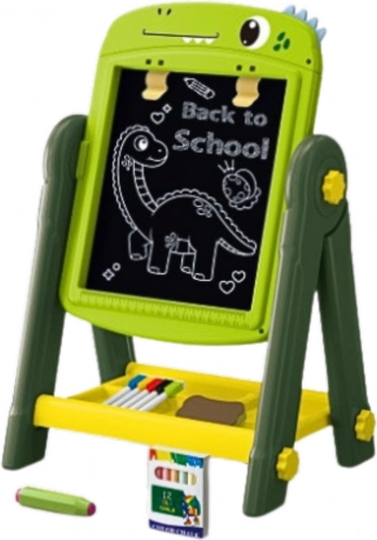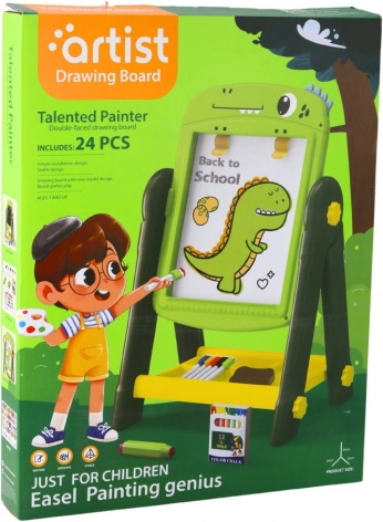 Le tableau comprend des pinces pour fixer du papier, permettant aux enfants de créer de véritables œuvres d’art. L’emballage inclut un riche ensemble d’accessoires, notamment des marqueurs, des craies, une éponge et des aimants colorés avec lettres, chiffres et symboles mathématiques.