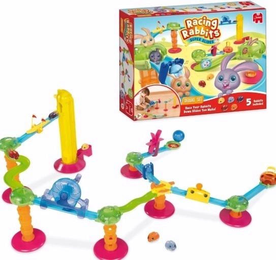 Découvrez l’univers palpitant de Racing Rabbits – un kit de construction de pistes modulaire qui permet de créer des circuits uniques à partir d’éléments simples. Construisez un toboggan avec le set deluxe et regardez les lapins filer sur la piste !