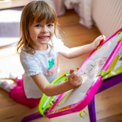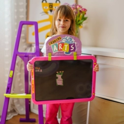 Structure légère et stable avec une étagère pour accessoires qui garde tout à portée. Le tableau convient dès 3 ans et aide à développer la créativité, la coordination œil–main et la coopération lors des activités partagées. La fonction fluorescente est alimentée par des piles AAA.