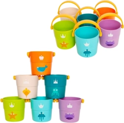 Ce set de seaux colorés est un excellent choix pour les tout-petits à partir de 12 mois. Il contient 6 seaux légers et colorés décorés de motifs marins, qui peuvent s'empiler ou être utilisés pendant le bain. Grâce aux différentes couleurs, formes et motifs, l'ensemble stimule efficacement les sens de l'enfant et encourage le jeu créatif.