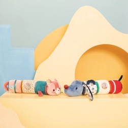 Ce jouet en tissu amusant avec rouleaux offre aux enfants non seulement la possibilité d'empiler et de démonter, mais aussi diverses stimuli sensoriels :
