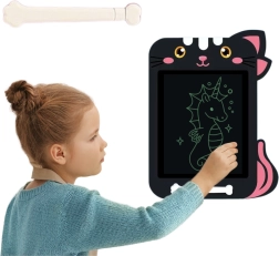 Tablette LCD magique en forme de chat noir, un outil créatif et éducatif pour les enfants, qui favorise le développement de l’imagination, des compétences manuelles et de la concentration.