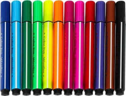 La boîte contient 2 marqueurs noirs pour dessiner, 12 feutres de couleur pour colorier et un câble USB pour une recharge facile.