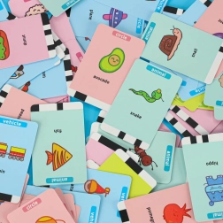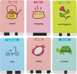 Un lot de 100 cartes avec illustrations et noms anglais favorise l’acquisition naturelle du vocabulaire via une interaction ludique.