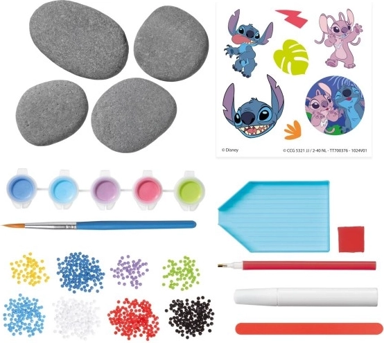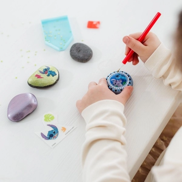 Ce kit créatif amusant garantit des heures d’activités manuelles. Grâce aux décalcomanies autocollantes et à environ 400 strass décoratifs, créez facilement des galets originaux inspirés du motif Stitch. Une fois les galets du coffret utilisés, vous pouvez continuer avec vos trouvailles de la nature.