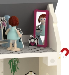 Cette maison de poupées vintage offre une expérience de jeu exceptionnelle pour les enfants. Elle est équipée d’accessoires d’intérieur uniques, comprenant : un lit avec couvre-lit, une baignoire, un canapé, une lampe, une table, deux chaises, une cuisine et un réfrigérateur.