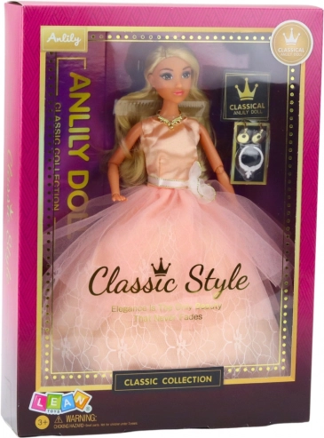 La poupée Anlily en robe de soirée poudrée se distingue grâce à un plissé décoratif en éventail et un nœud ornemental. Elle possède de longs cheveux blonds que l’on peut coiffer et styliser, et son maquillage délicat ainsi que ses traits marqués lui confèrent une allure chaleureuse et élégante. Avec ses membres articulés – bras, jambes et tête – la poupée est idéale pour un jeu dynamique, les changements de tenue et la création d’histoires du quotidien comme de contes.