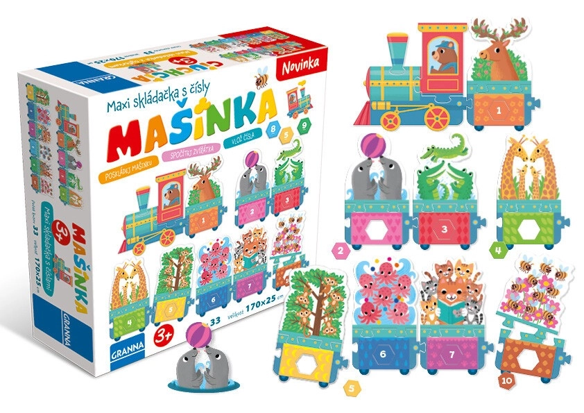 Avec Granna Mašinka, compter devient vraiment amusant ! Ce maxi puzzle permet aux enfants de construire un train, d’attacher les wagons, de compter les animaux et d’apprendre à associer les bons chiffres.