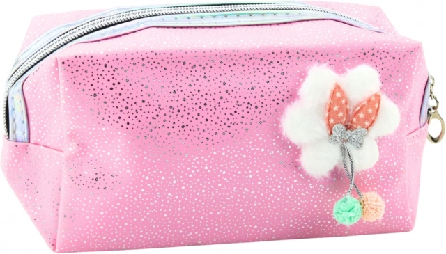 Cette trousse pour maquillage ou fournitures scolaires est réalisée dans une teinte rose élégante et décorée de délicates paillettes. Sur l’avant, une adorable application en forme de nuage duveteux avec un petit nœud est agrémentée de deux perles décoratives, conférant à l’ensemble un charme unique.