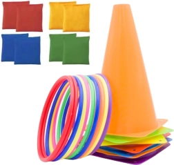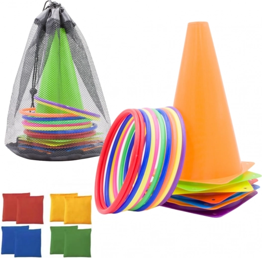 Le contenu de l'ensemble inclut 11 cerceaux colorés, excellents pour les jeux de lancer et les activités d'adresse, 6 cônes d'entraînement pour des parcours d'obstacles et 10 sacs de gymnastique pouvant être utilisés pour des jeux sensoriels, le lancer ou comme poids. Tous les composants sont fabriqués à partir de matériaux durables et sûrs, adaptés aux enfants et aux adultes.
