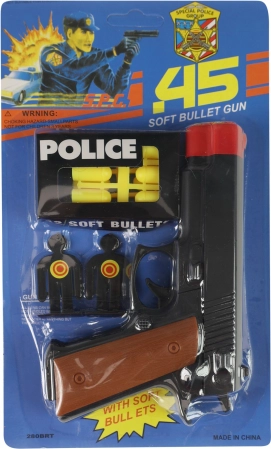 Pistolet de police pour enfants avec cibles et munitions souples. Jeu sûr, entraînement à la précision et action à la maison comme en extérieur. Léger et facile à manipuler.