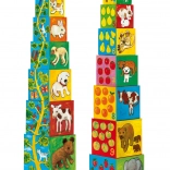 Tour de cubes Amis de la marque Djeco est un jouet éducatif richement illustré et coloré, qui aide les enfants à développer leurs compétences motrices et leur logique.