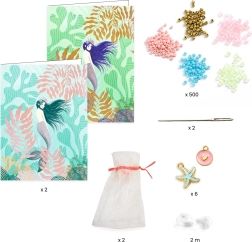 - 500 perles, 8 breloques, 2 fils élastiques, 2 aiguilles, 1 mode d’emploi, 2 sachets en organza, 2 cartes illustrées