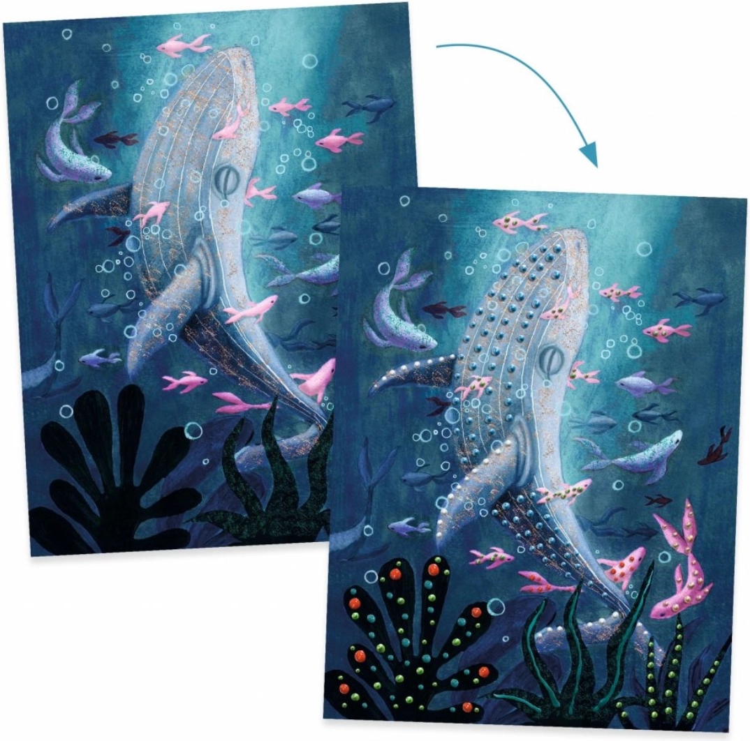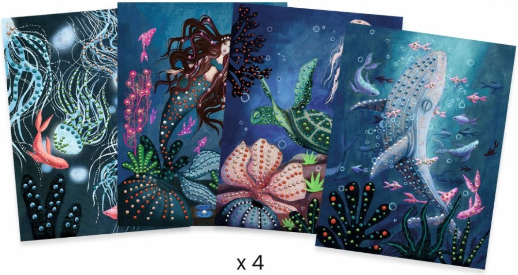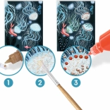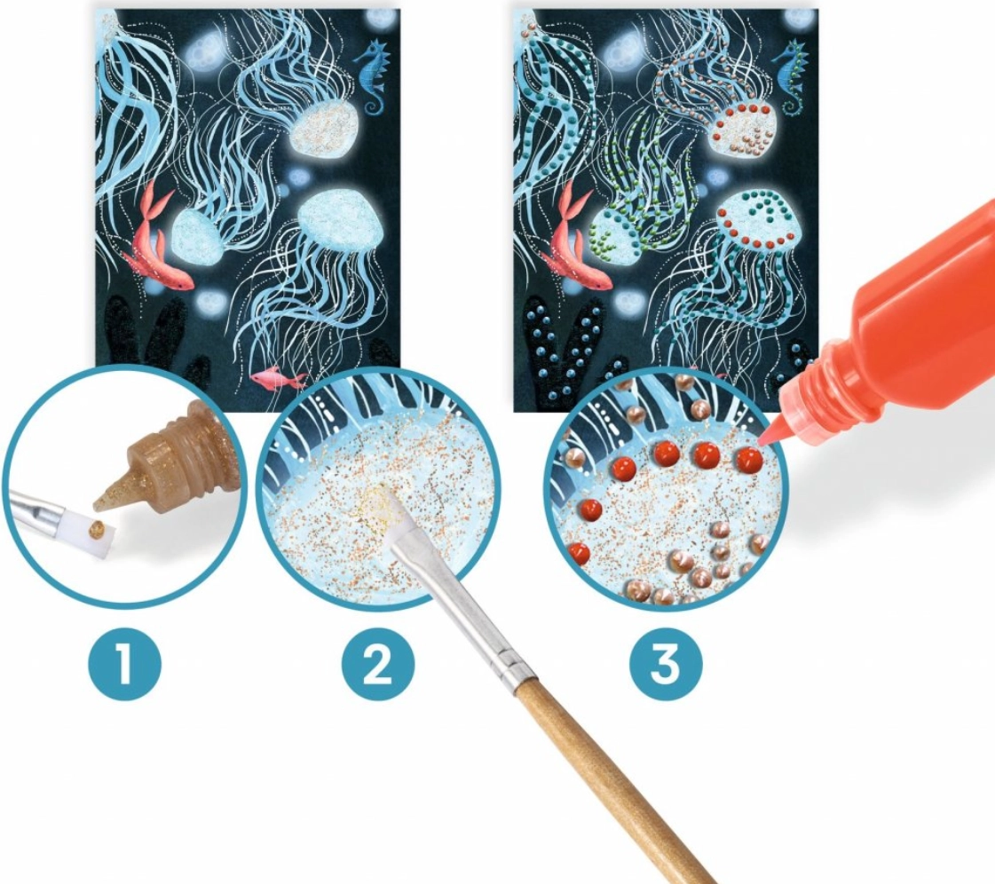 Découvrez le monde sous-marin de la créativité avec le kit créatif DJECO. Les enfants réalisent quatre images saisissantes aux effets variés grâce à des peintures nacrées et un pinceau. Le kit offre une peinture texturée unique pour des points et des lignes en relief, un dosage facile grâce aux mini-flacons à embout, et différents finis – nacré, pailleté et mat.