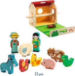• 9 figurines en bois – poule, coq, canard, âne, mouton, cochon, vache, fermier et fermière.