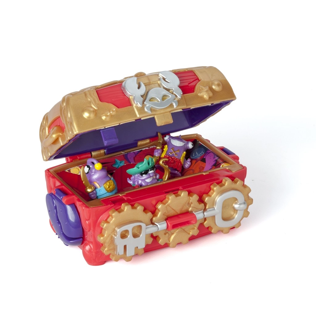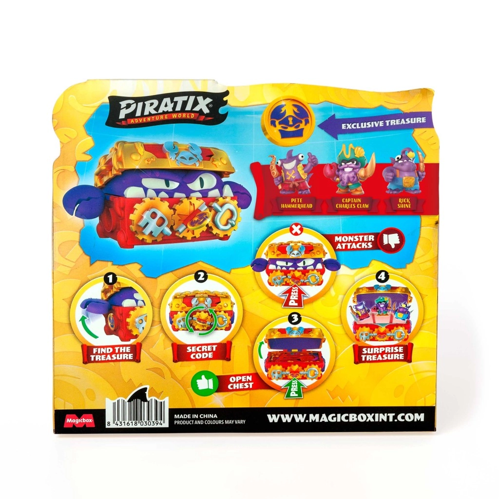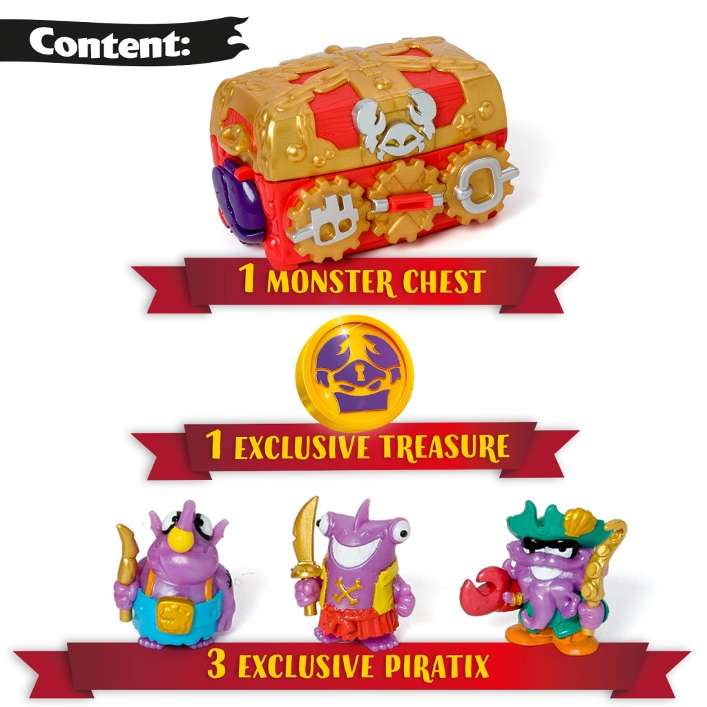 1 Coffre du Trésor du Monstre, 3 figurines Piratix exclusives, 1 pièce de trésor exclusive, 3 accessoires
