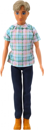 La poupée garçon Anlily porte une chemise stylée à motif à carreaux, un pantalon bleu foncé et des chaussures marron. Des accessoires stylés sont inclus, tels qu'une valise grise à roulettes avec poignée télescopique, une perche à selfie avec téléphone, des lunettes de soleil et une bouteille d'eau.