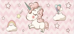 Le tapis est fabriqué en caoutchouc souple mais résistant, assurant une adhérence stable à la surface du bureau et empêchant tout glissement. La couche supérieure du matériau est agréable au toucher et résistante à l’abrasion. Le design rose avec des motifs de licorne, de nuages et de petites étoiles crée une atmosphère féerique et dynamise l’espace.