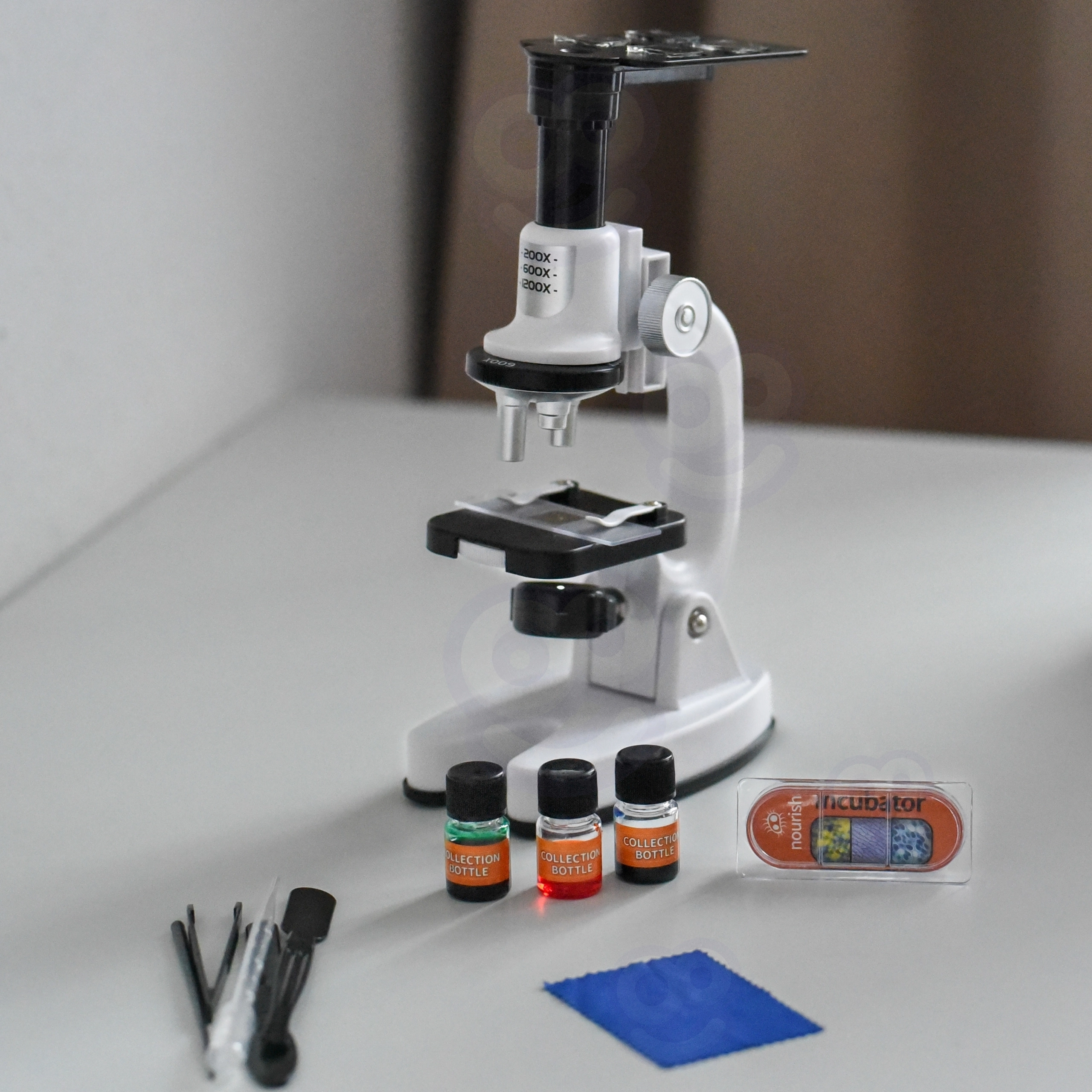 Lames, lamelles couvre-objet, flacons, pince, pipette, outils et rangement – tout ce dont les enfants ont besoin pour préparer et observer des échantillons.