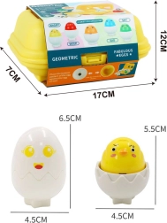 Chaque œuf se compose de deux parties : une coquille supérieure et une coquille inférieure reliée à la figurine du poussin. La tâche des enfants est non seulement d’associer la bonne coquille, mais surtout de la placer au bon emplacement dans le plateau. Chaque œuf possède au-dessous une forme géométrique unique correspondant à l’un des trous de la boîte. Les visages amusants sont un excellent moyen d’apprendre aux enfants à reconnaître et nommer les émotions.