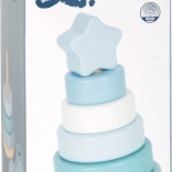 Tour en bois pour enfants dans des tons pastel de bleu, ornée d’une étoile au sommet. Elle aide à améliorer les capacités motrices et la coordination.