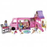 Ouvrez le véhicule pour révéler une grande scène de jeu : coin repas, petite cuisine avec barbecue, balançoire, salon sur le toit, piscine, équipement de camping et couchage douillet sous la tente.