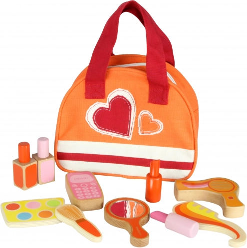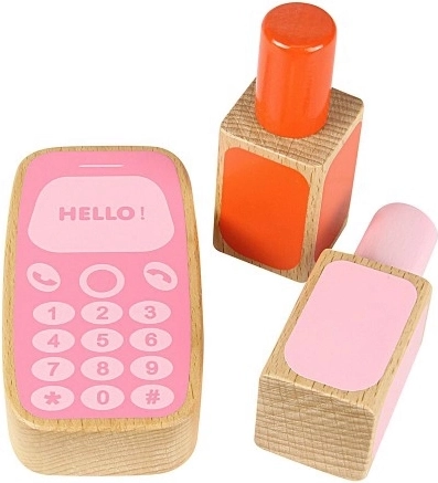 Le set comprend de nombreux éléments intéressants, indispensables pour le stylisme au quotidien : vernis à ongles, rouge à lèvres, sèche-cheveux, brosse à cheveux, palette de fards à paupières avec pinceau, petit miroir, pinceau et même un téléphone portable. C’est un ensemble que l’on retrouve dans chaque sac à main ou trousse de maquillage !