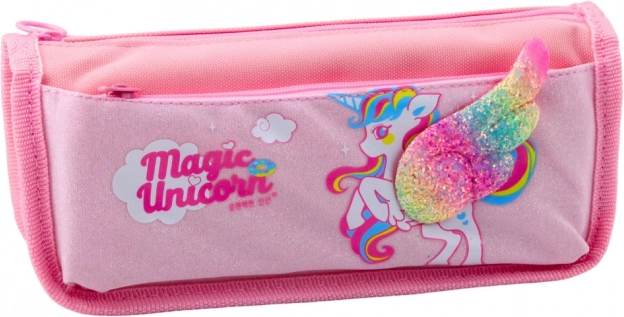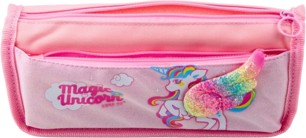 Trousse scolaire rose avec motif de licorne en 3D, un accessoire adorable et fonctionnel pour l’école. Son design féerique avec une aile pailletée en relief lui confère une allure magique.