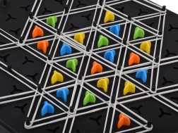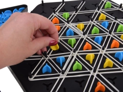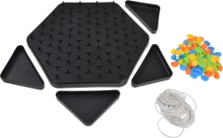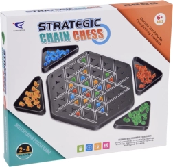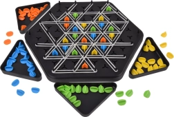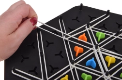 Les Échecs en chaîne sont un jeu de plateau original dans lequel les joueurs tendent tour à tour des élastiques colorés entre les potelets du plateau. Chaque nouvel élastique doit être en ligne droite, toucher au moins un élastique déjà posé et s’étendre vers une nouvelle colonne du plateau. Dès que vous fermez un triangle, vous le marquez avec votre jeton. La partie se termine lorsqu’aucun nouveau triangle ne peut être créé — le vainqueur est le joueur qui a le plus de formes occupées.