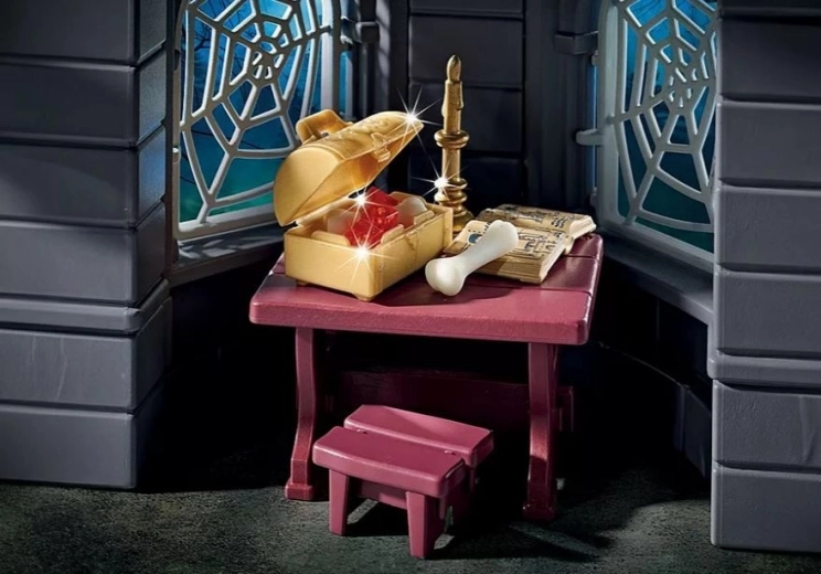 Le set promotionnel PLAYMOBIL comprend des ruines de château soigneusement conçues, 3 figurines, un coffre/tombe, plusieurs araignées, des chauves-souris et d’autres éléments effrayants qui ajoutent tension et amusement au jeu.