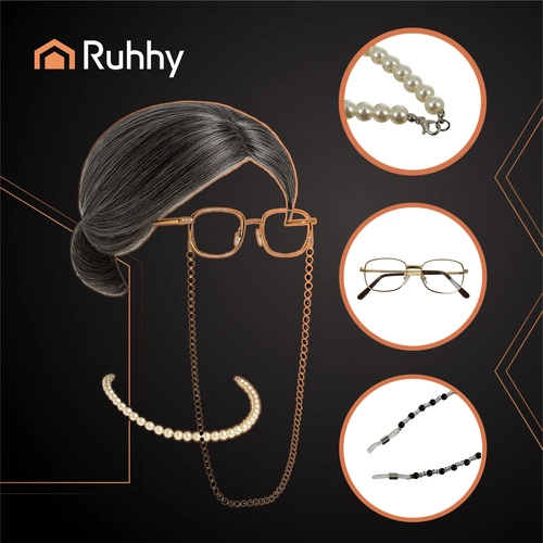 - Set complet – perruque, bonnet, lunettes, chaîne et collier de perles.