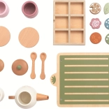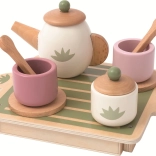 Un élégant service à thé en bois pour petits hôtes qui apporte jeu créatif et apprentissage. Sur le plateau avec tiroir, vous trouverez une théière avec couvercle, deux tasses avec cuillères, un sucrier et des « sachets de thé » à motifs. L’ensemble développe le jeu imaginatif, la motricité fine et les compétences sociales, tout en séduisant par ses couleurs pastel et son bois naturel de qualité.