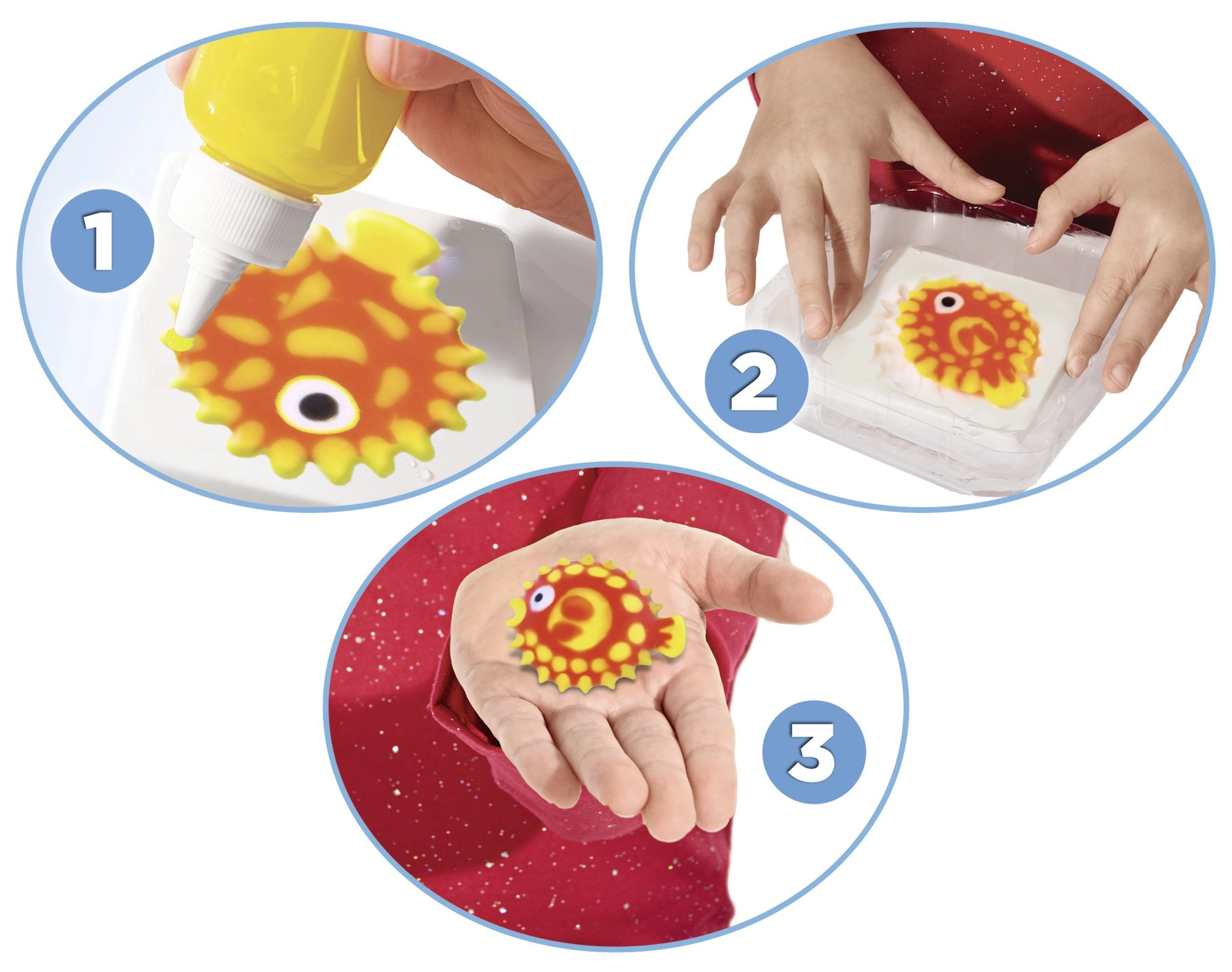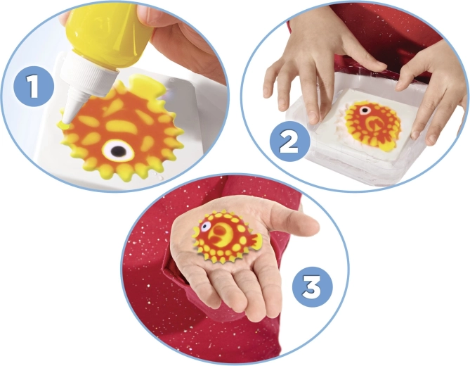 Mélangez la solution, remplissez le moule avec le gel et plongez dans l’eau – en un instant, une figurine 3D souple prête à jouer apparaît.
