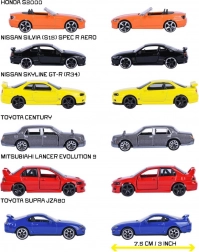 Grâce aux parties ouvrantes (p. ex. portes, capot ou coffre) et aux roues libres, ces miniatures sont parfaites pour le jeu comme pour l’exposition de collection. L’emballage peut contenir l’un des modèles populaires des marques NISSAN, MITSUBISHI, TOYOTA ou HONDA de la série Japan en édition limitée.