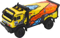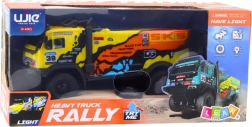 Camion RC jaune réaliste avec accents bleus et orange, offrant un pilotage facile via la télécommande et des effets sonores de klaxon réalistes. Un excellent choix pour les enfants qui aiment la conduite rapide et dynamique et un design attrayant.