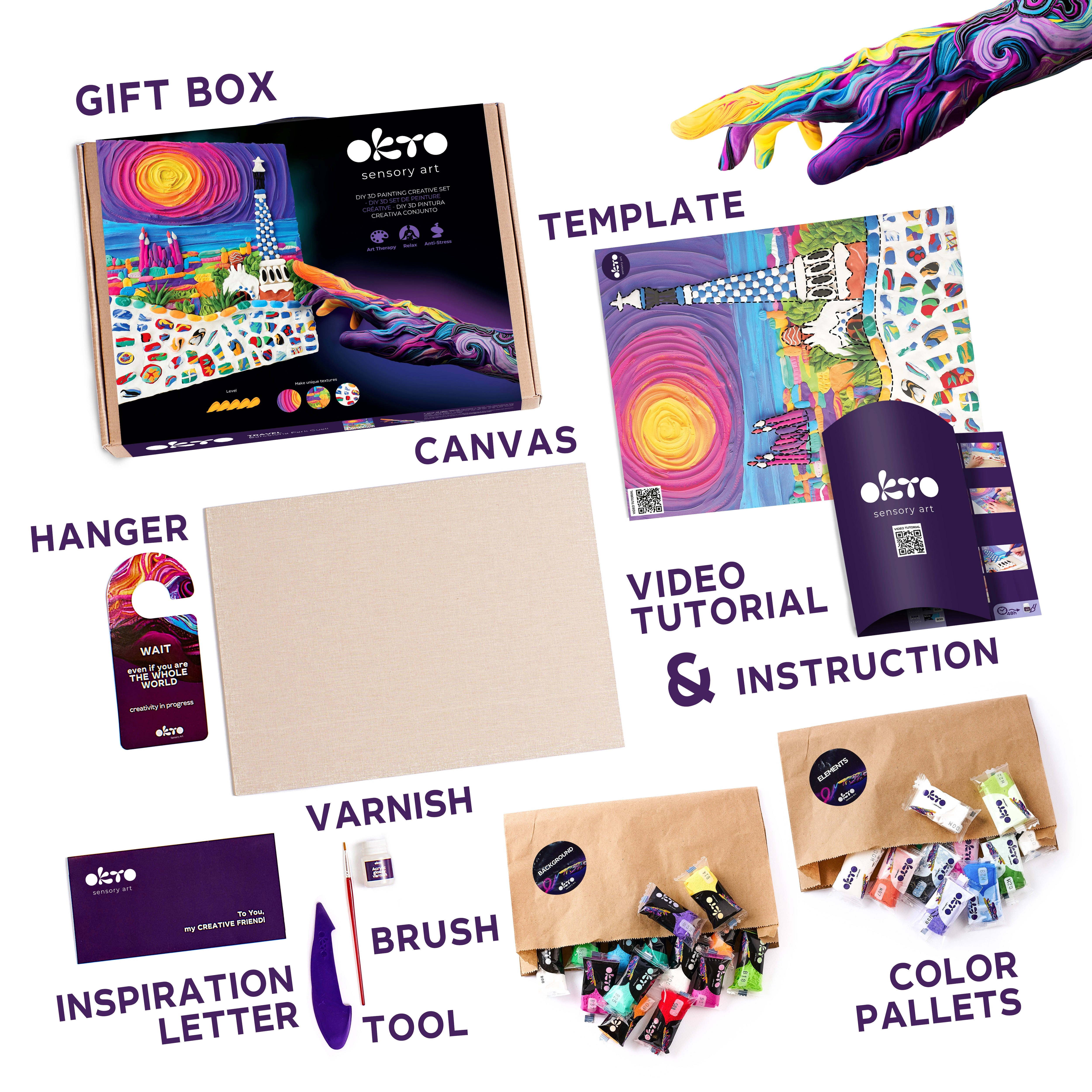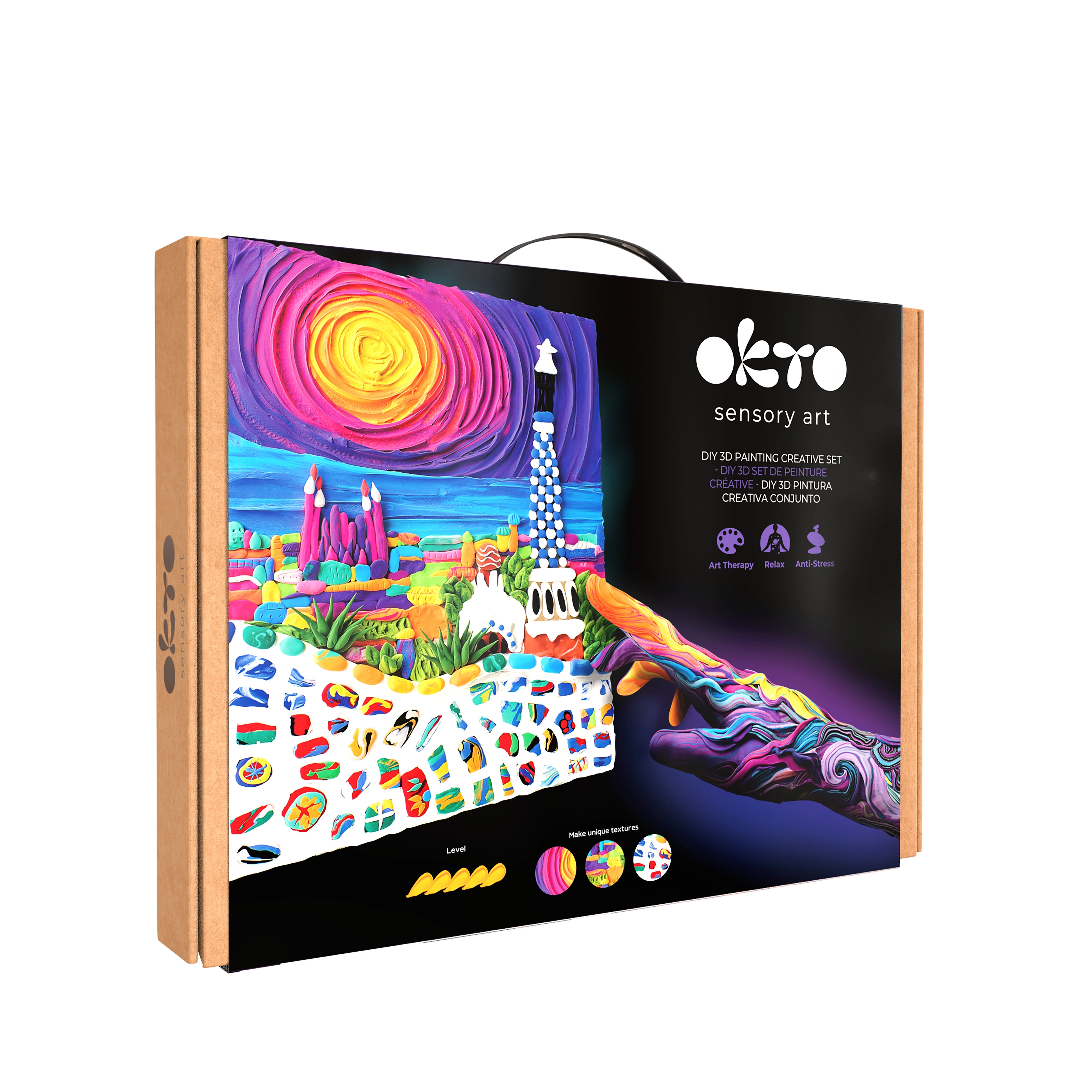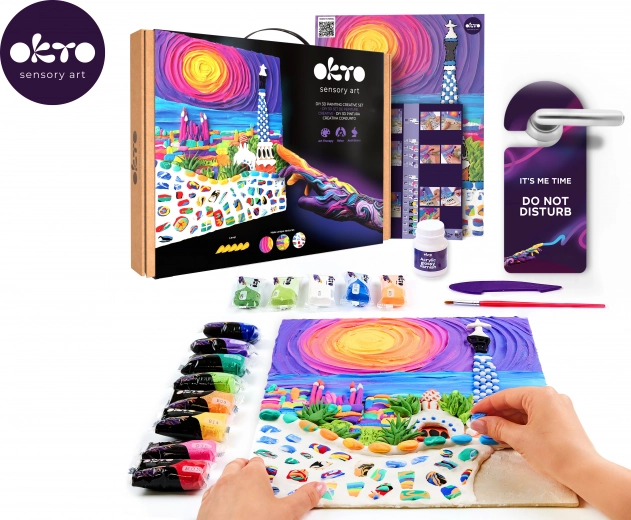 Ce kit créatif premium OKTO vous permet de créer un tableau en relief avec une texture unique et des détails ludiques inspirés par l’architecture de Barcelone. Grâce à la pâte autodurcissante, vous obtenez un effet 3D impressionnant qui ressortira après l’application du vernis acrylique, garantissant une protection durable.
