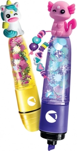 Le set comprend plusieurs encres colorées, des corps de surligneurs vides, de petites décorations et des accessoires pour l’assemblage. Les enfants choisissent une couleur, remplissent le marqueur, le décorent avec des figurines d’animaux magiques et obtiennent un accessoire scolaire original.